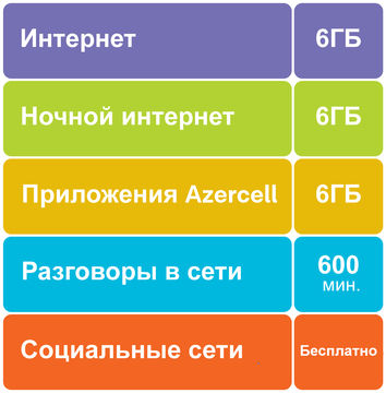 В рамках тарифа предоставляется 6 ГБ общего трафика, 6 ГБ ночного трафика (с 00:00 до 07:00), а также 6 ГБ интернет трафика для приложений Azercell ( ZVUK , Ivi , Bookmate ).
